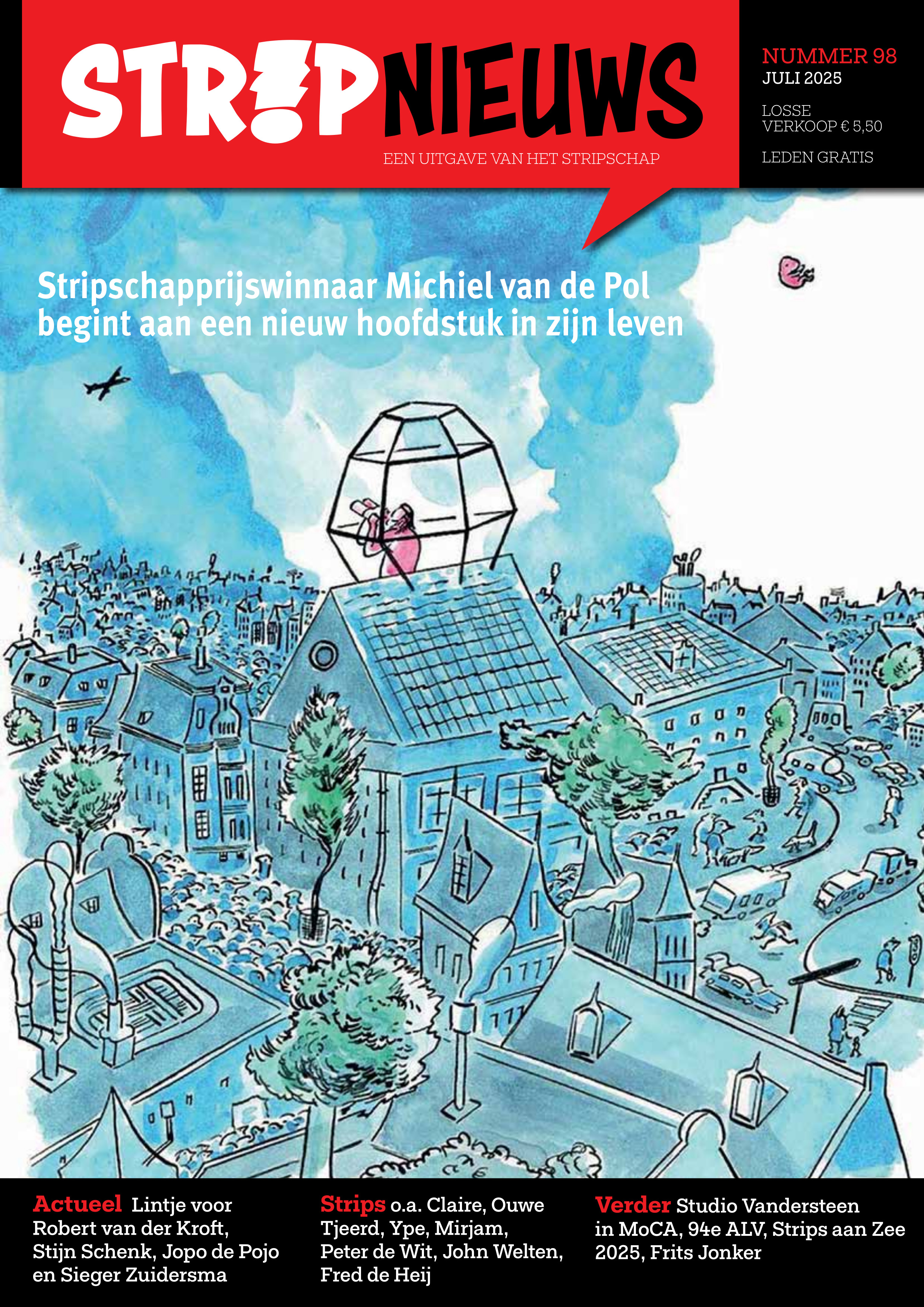 StripNieuws 98 werd op tijd door de leden en de relaties ontvangen, met dank aan iedereen die aan het nummer heeft meegewerkt, in het bijzonder de nieuwe vormgever John Asselbergs die steeds meer zijn draai weet te vinden door op een speelse manier met de vormgeving van Mark van Herpen te stoeien. Heel fijn om die ontwikkeling te zien. In dit nummer interviews met Stripschapprijswinnaar Michiel van de Pol, uitgever Stijn Schenk. de mannen van Stripwinkel Jopo de Pojo in Haarlem en de minder bekende Groningse stripmaker Sieger Zuidersma.